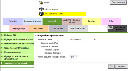 En mode Administrateur, sélectionnez [Sécurité] - [Param. Sécurité rapide], puis configurez les paramètres suivants.