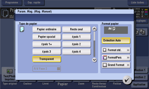 ] - [Modif. param mag] - [Type de papier] - [Transparent].