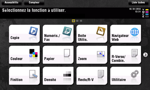 Le menu principal peut occuper trois écrans si nécessaire. Il peut afficher 12 touches raccourcis sur chaque écran et jusqu'à 25 touches raccourcis sur trois écrans. [Utilitaire] s'affiche de manière fixe en bas à droite de la première page.