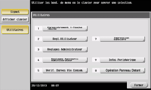 Tapez sur [Utilitaire] sur le menu principal pour voir les réglages ou le statut d'utilisation de cette machine.