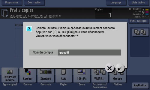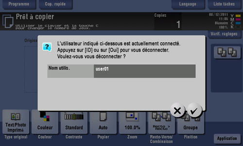 Si vous n'utilisez pas cette machine pendant un certain laps de temps pendant la connexion (par défaut : une min.) vous serez automatiquement déconnecté.