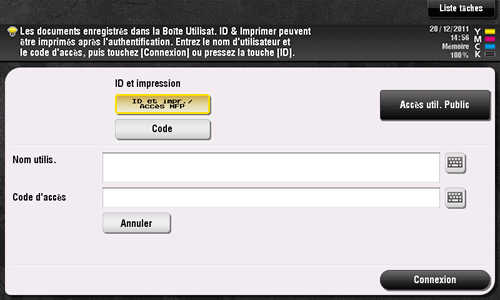 Si Accès util. Public (utilisateurs non enregistrés) est activé, appuyez sur [Accès util. Public] pour vous connecter à cette machine.