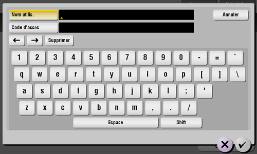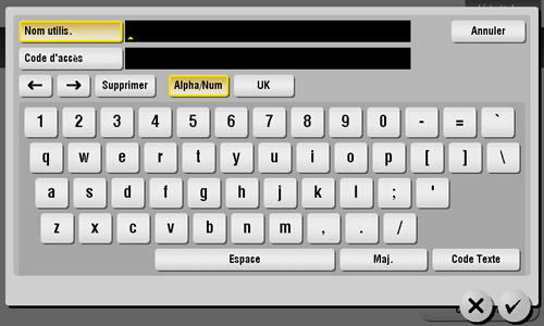 Si le mot de passe contient un caractère, tapez sur la zone de saisie ou sur l'icône de clavier de [Code d'accès] et entrez ensuite le mot de passe.