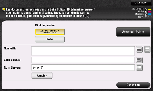 Entrez le nom d'utilisateur et le code d'accès, et sélectionnez un serveur d'authentification. Il se peut que le contenu de l'écran Connexion varie en fonction du réglage d'authentification de cette machine.