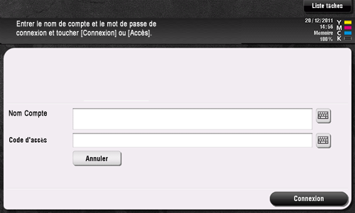 Entrez le nom de compte et le code d'accès pour effectuer l'authentification. Il se peut que le contenu de l'écran Connexion varie en fonction du réglage d'authentification de cette machine.