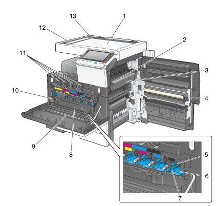 11 | Cartouche de toner | Cette machine utilise une Cartouche de toner en quatre couleurs : cyan (C), magenta (M), jaune (Y), et noir (K). Une image pleine couleur est créée par la combinaison des quatre couleurs de toner. |