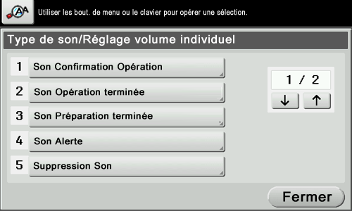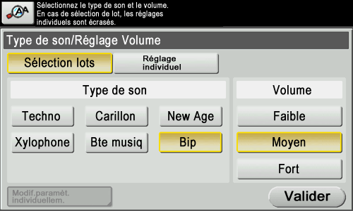 [Type de son/Réglage Volume] | Spécifiez le type et le volume du son pour chaque [Son Confirmation Opération], [Son Opération terminée], [Son Préparation terminée], [Son Alerte], [Suppression Son] et [Son d'authentification]. Si [Sélection lots] est sélectionné, tous les sons et les volumes de son seront réglés en une fois. Sélectionnez le type de son parmi six types et sélectionnez le volume sonore entre [Fort] [Moyen] [Faible] pour le réglage. Si [Réglage individuel] est sélectionné, tous les types de son et de volumes seront réglés séparément. |