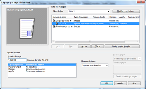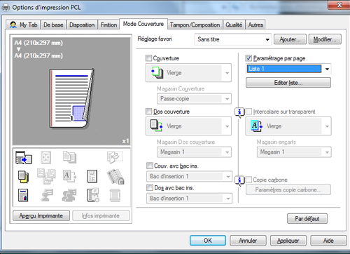 Pour imprimer des couvertures de chapitre sur un différent type de papier, cochez la case [Paramétrage par page] sur l'onglet [Mode Couverture].
