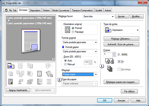 Dans [Format original] sur l'onglet [De base], sélectionnez [Enveloppe] ou [Carte postale].