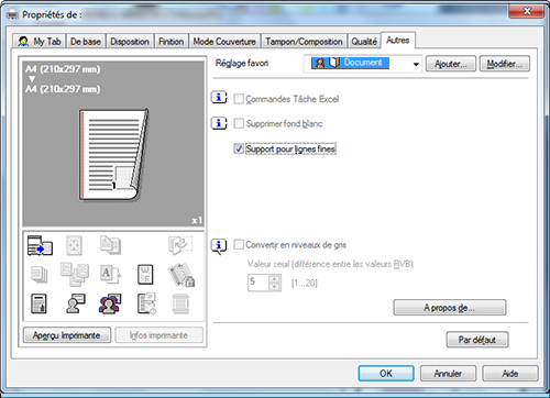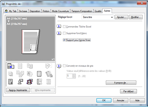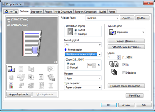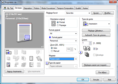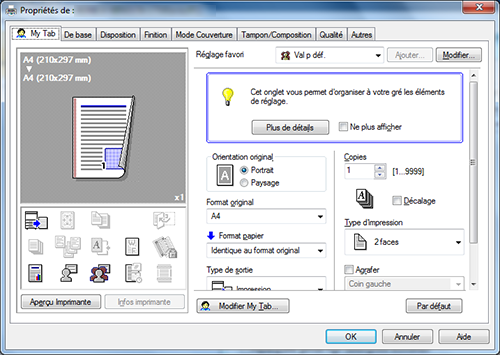 A15. Oui. Vous pouvez aisément personnaliser la fenêtre à partir de la fenêtre des propriétés du pilote d'imprimante en enregistrant des fonctions fréquemment utilisées en masse sur My Tab (Mon Onglet) ou en enregistrant les réglages des différents onglets en tant que favoris pour une activation rapide.