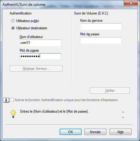 R2. Dans la fenêtre Propriétés du pilote d'imprimante, changez l'authentification utilisateur sur le réglage correct.