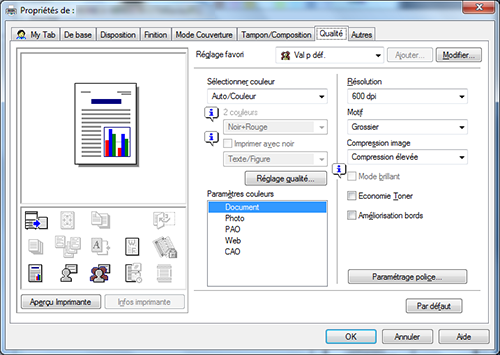 Sous [Paramètres couleurs] de l'onglet [Qualité], sélectionnez le type de document à imprimer.