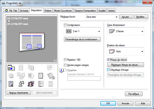 Pour configurer la marge de page, cochez la case [Marge de reliure] sur l'onglet [Disposition] et cliquez sur [Réglages Marge de reliure...].