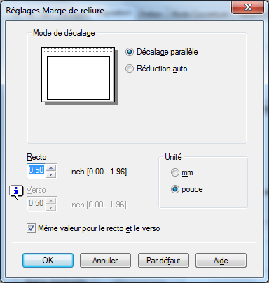 [Recto]/[Verso] | Entrez la largeur de la marge de page. Pour l'impression recto-verso, le fait de décocher la case [Même valeur pour le recto et le verso] vous permet de spécifier différentes valeurs pour le recto et le verso. |