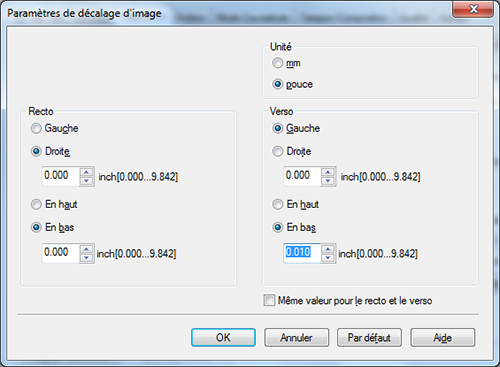[Recto]/[Verso] | Définissez la direction et la valeur pour décaler la position d'impression. Pour l'impression recto-verso, cochez la case [Même valeur pour le recto et le verso] pour vous permettre de spécifier la même valeur pour le recto et le verso. |