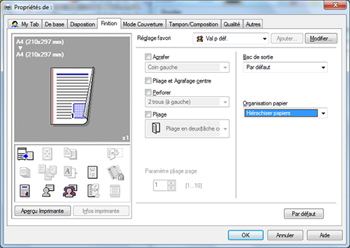 Cochez la case de la finition souhaitée sur l'onglet [Finition]. Si vous avez coché la case [Agrafer], [Perforer] ou [Pliage], spécifiez la quantité, les positions et d'autres réglages nécessaires.