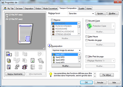 Pour imprimer un document sur un document imprimé à partir d'un fichier créé sur un ordinateur, sélectionnez [Imprimer image du serveur] sous [Superposition] sur l'onglet [Tampon/Composition], puis sélectionnez le fichier pour la surimpression.