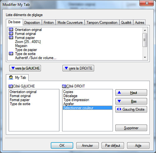 Pour enregistrer des fonctions sur My Tab, sélectionnez les fonctions à enregistrer depuis [Liste éléments de réglage] et cliquez sur [vers la GAUCHE] ou sur [vers la DROITE].