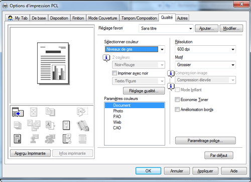 Le réglage de niveaux de gris sera appliqué à chaque fois que l'imprimante sera utilisée dans n'importe quel logiciel d'application.