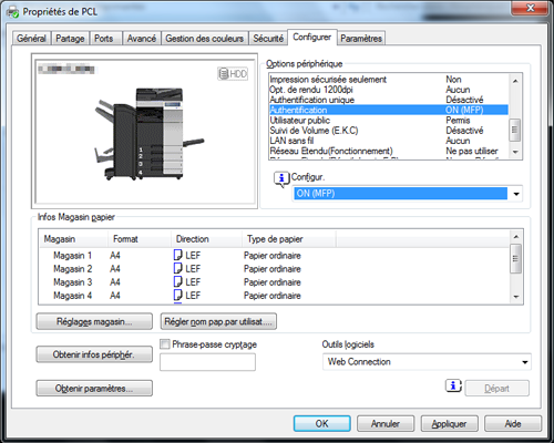Sous [Options périphérique] de l'onglet [Configurer], sélectionnez [Authentification], puis sélectionnez l'état d'authentification sous [Paramétres].