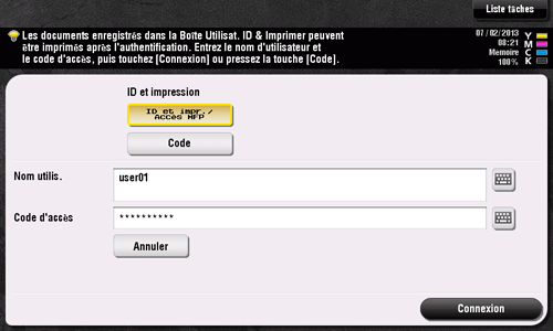 Sélectionnez [ID et impr./Accès MFP], entrez votre nom d'utilisateur et votre mot de passe, puis effleurez [Connexion].