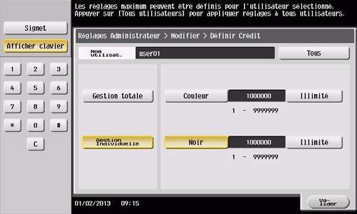 Tapez sur [Crédit Max] et [Couleur] ou [Noir], puis entrez le crédit maximum pour le nombre d'originaux en couleur/noir que l'utilisateur peut imprimer, en utilisant le clavier.