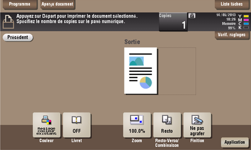 Vous pouvez changer les réglages pour [Couleur], [Zoom], [Recto-Verso/Combinaison] et [Finition].