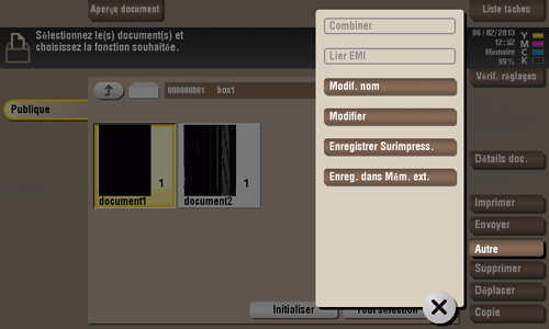 Pour imprimer, tapez sur [Autre] et ensuite [Combiner]. Pour envoyer, tapez sur [Autre] et ensuite [Lier EMI].