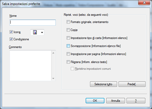 Specificare l'icona, il commento e le voci da richiamare per il preferito, come necessario.