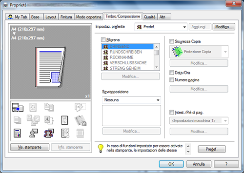 [Filigrana] | Selezionare questa scheda per stampare una filigrana (timbro di testo) sull'originale. Inoltre, nell'elenco, selezionare la filigrana che si desidera stampare. Facendo clic su [Modifica...]è possibile registrare o modificare una filigrana. Per informazioni dettagliate, fare riferimento a Qui. | |