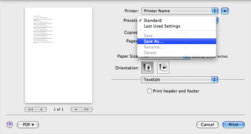 Modificare le impostazioni di stampa, quindi selezionare [Save As...] o [Current Print Settings as Preset] in [Presets:].