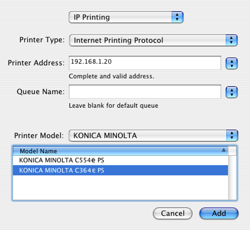 In [Printer Address:], inserire l'indirizzo IP della macchina.