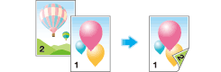 Qui di seguito è descritto il flusso operativo in cui diversi originali 1 lato vengono copiati, due pagine sono ridotte nella stessa facciata di una pagina e stampate su entrambi i lati della carta.