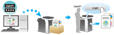 Quando si stampa un documento dal PC nell'ambiente di sistema dell'autenticazione utente, i file trasferiti con la funzione ID e stampa sono memorizzati nella Casella ID e stampa. Quando un utente che ha inviato i dati di stampa accede alla macchina e apre la casella utente, potrà visualizzare in anteprima, stampare o eliminare il file memorizzato.