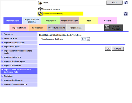 Nel modo amministratore, selezionare [Manutenzione] - [Impostazione visualizzazione CodErrore Rete] e impostare [Visualizzazione CodErrore] su [ON] (predefinito: [OFF]).