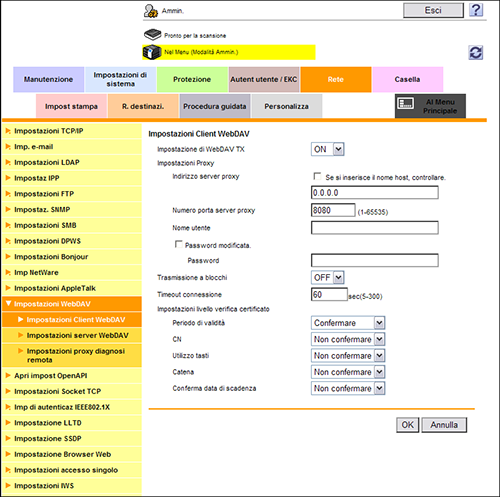 Nel modo amministratore, selezionare [Rete] - [Impostazione WebDAV] - [Impostazioni Client WebDAV], quindi configurare le seguenti impostazioni.