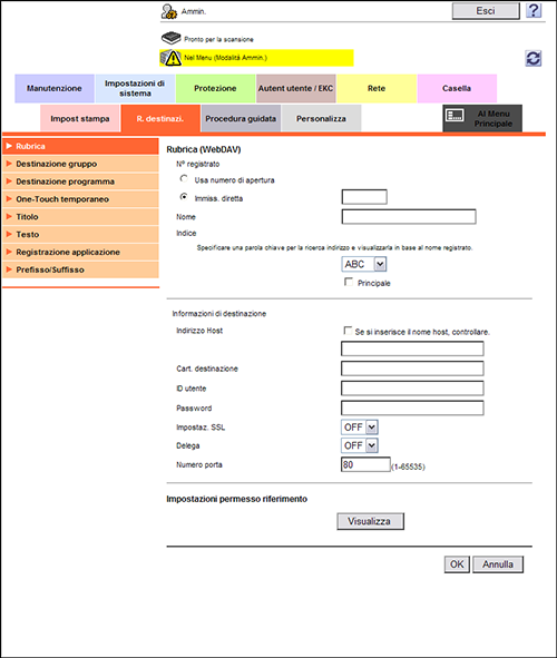 Nel modo amministratore, selezionare [R. destinazi.] - [Rubrica] - [WebDAV] e impostare [Impostaz. SSL] su [ON] (predefinito: [OFF]).