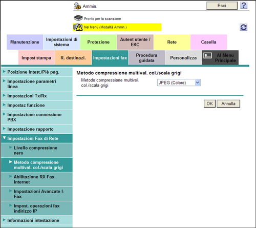 Nel modo amministratore, selezionare [Impostazioni fax] - [Impostazioni Fax di Rete] - [Metodo compressione multival. col./scala grigi], quindi configurare le seguenti impostazioni.