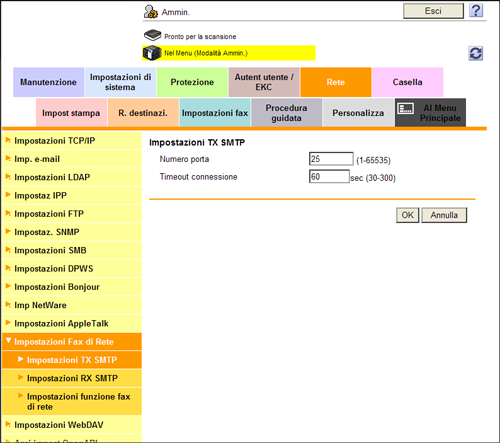 Nel modo amministratore, selezionare [Rete] - [Impostazioni Fax di Rete] - [Impostazioni TX SMTP], quindi configurare le seguenti impostazioni.