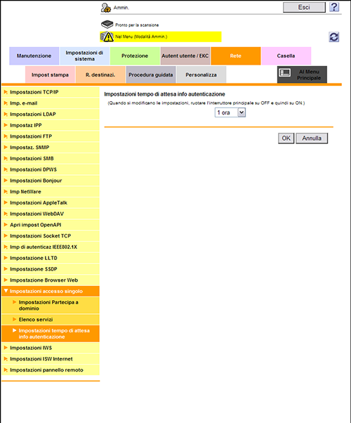 Nel modo amministratore, selezionare [Rete] - [Impostazioni accesso singolo] - [Impostazioni tempo di attesa info autenticazione], quindi modificare il tempo di conservazione delle informazioni di autenticazione nella macchina.