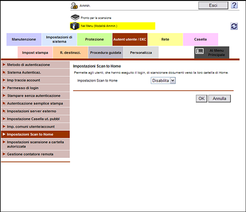 Nel modo amministratore, selezionare [Autent utente/EKC] - [Impostazioni Scan to Home], e impostare [Impostazioni Scan to Home] su [Abilita] (predefinito: [Disabilita]).