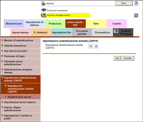 Nel modo amministratore, selezionare [Autent utente/EKC] - [Impostazioni autenticazione scheda LDAP/IC] - [Impostazioni autenticazione scheda LDAP/IC], impostare [Impostazioni autenticazione scheda LDAP/IC] su [ON] (predefinito: [OFF]).
