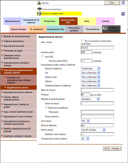 Nel modo amministratore, selezionare [Autent utente/EKC] - [Impostazioni autenticazione scheda LDAP/IC] - [Registrazione server] - [Modifica], quindi configurare le seguenti impostazioni.