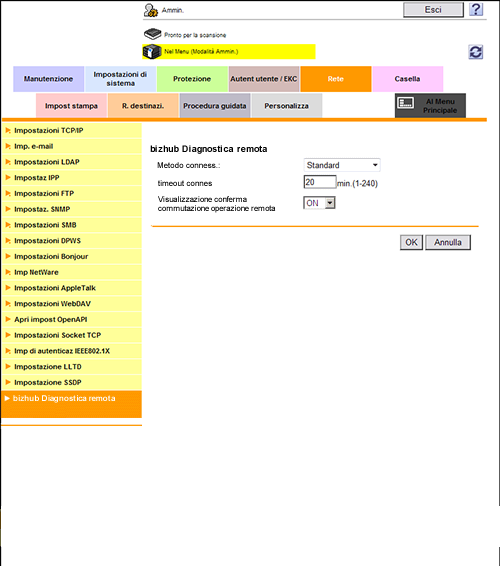 Nel modo amministratore, selezionare [Rete] - [Diagnostica remota bizhub], quindi configurare le seguenti impostazioni.