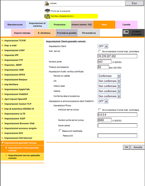 Nel modo amministratore, selezionare [Rete] - [Impostazioni pannello remoto] - [Impostazioni Client pannello remoto], quindi configurare le seguenti impostazioni.