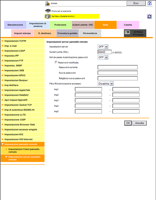 Nel modo amministratore, selezionare [Rete] - [Impostazioni pannello remoto] - [Impostazioni server pannello remoto], quindi configurare le seguenti impostazioni.