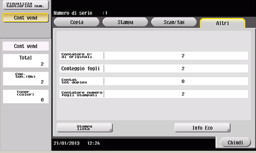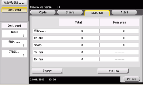 Verificare il numero totale di pagine originali scansionate nel modo Scan/fax o Casella utente, oltre che il numero totale di pagine in cui viene stampato un file presente in una Casella utente o un file ricevuto. Verificare inoltre il numero totale di pagine inviate e ricevute nel modo Fax.