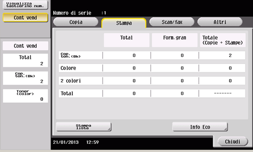 [Monocolore] | Indica il numero totale di pagine copiate in modo Monocromia. | Indica il numero totale di pagine copiate su carta di grande formato in modo Monocromia. | - |