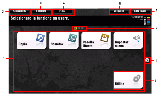 1 | Tasti menu principale | Visualizza i tasti scorciatoia assegnati a ogni funzione. I tasti scorciatoia possono essere personalizzati liberamente in base alle esigenze. Per impostazione predefinita, nel menu principale sono visualizzate le funzioni [Copia], [Scan/fax], [Casella Utente], [Impostaz. suono] e [Utilità]. (La funzione [Utilità] è fissa.)