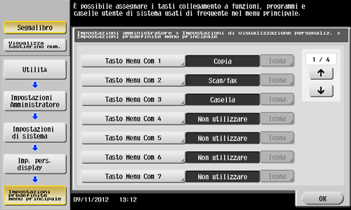 Toccare [Utilità] - [Impostazioni Amministratore] - [Impostazioni di sistema] - [Imp. pers. display] - [Impostazioni di visualizzazione menu principale].